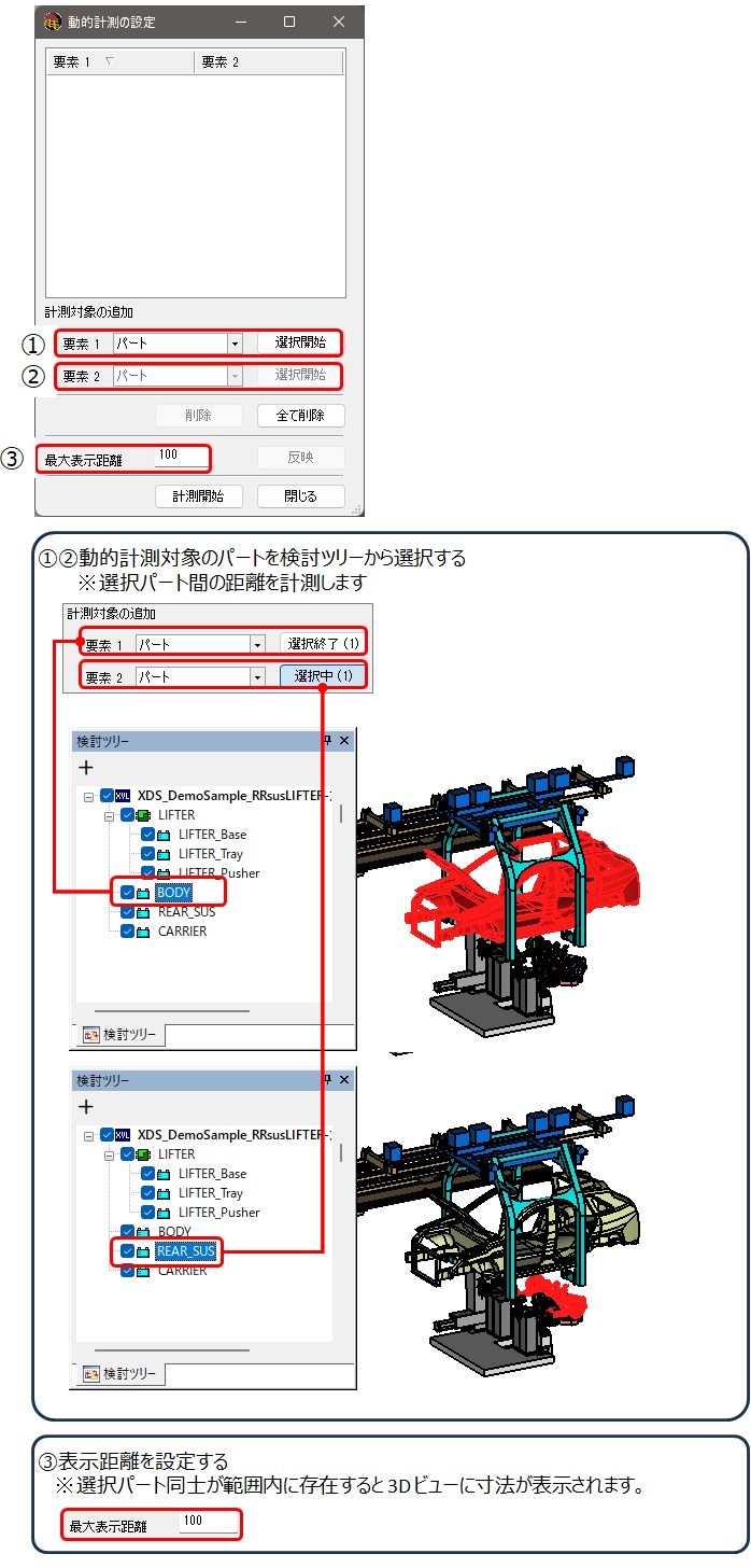 アニメーションが再生されます。対象パート同士が最大表示距離内に入ると3D ビューに寸法が 表示されます。 -