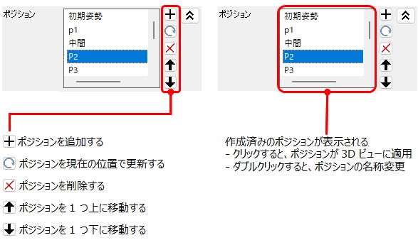 ポジションが登録され、現在の位置が記録されます。- 必要に応じて、ポジションをダブルクリックし名称を変更するヒント: ポジションをクリックすることで、それぞれの位置を適用できます。