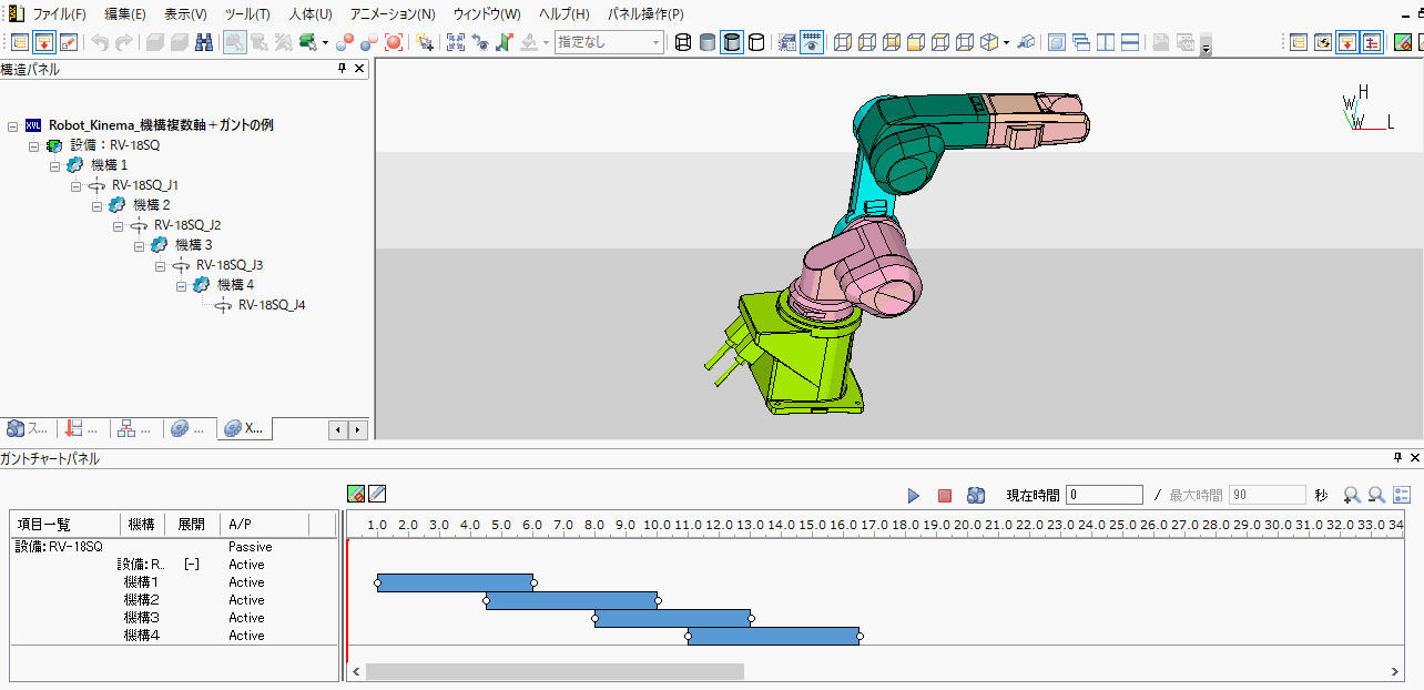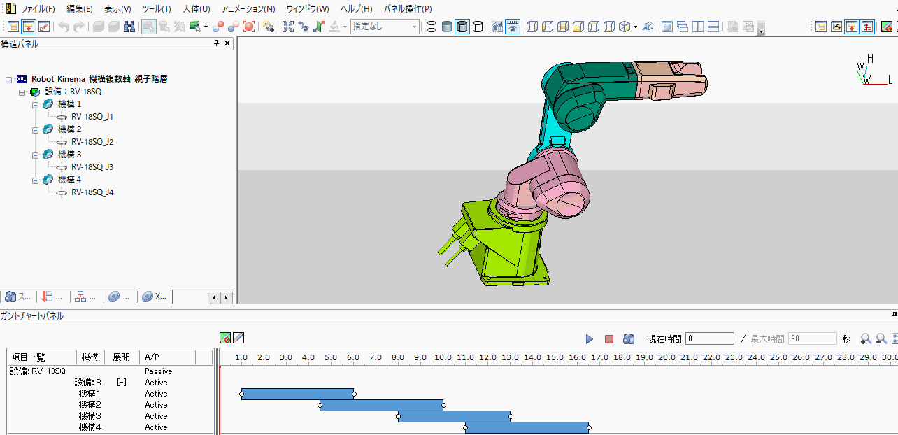 「機構」を並列階層で作成した場合と親子階層で作成した場合の違いは以下になります。並列階層で作成した場合、各機構が単独で動きます。親子階層で作成した場合、子の機構は親の動きに連動して動きます。