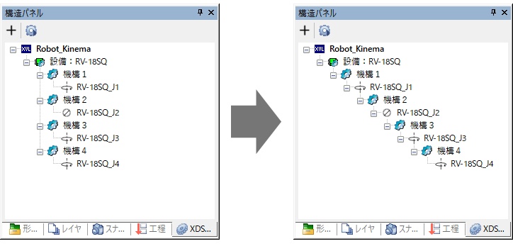 XDS 機構ツリーでは機構、軸の移動(親子の変更)ができます。