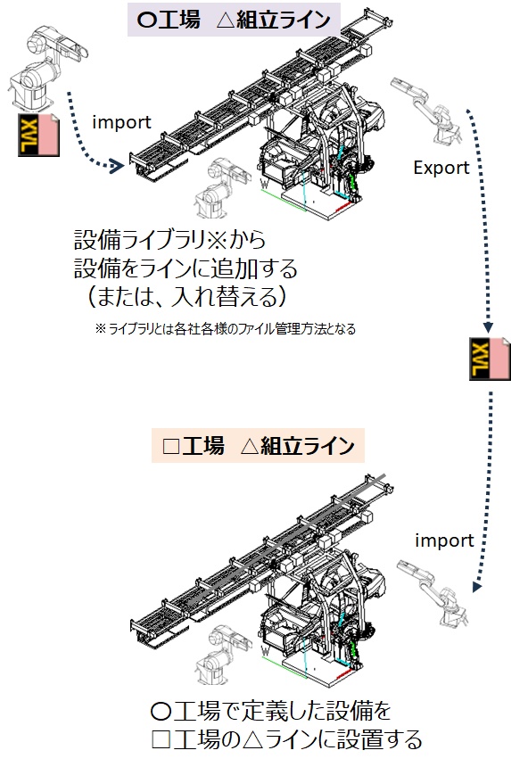 運用イメージ 狙い:設備単位に設定した構成(検討ツリー)、機構動作、ガントチャート(動作時間)を活かしライン全体の編集時間を減らし、早期確認着手や検討時間の確保を行います。また設備動作の標準化も可能となります。
