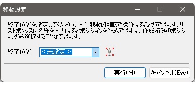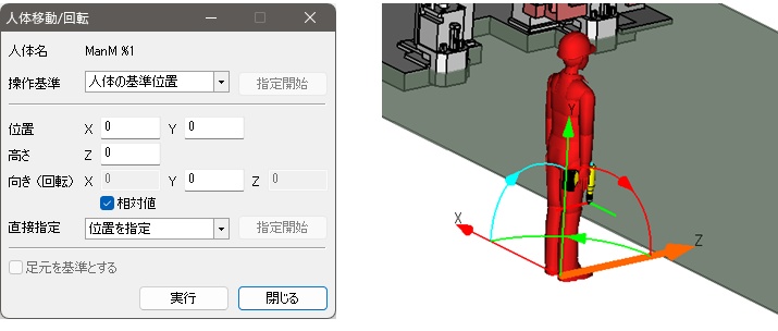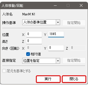 - 人体移動/回転ダイアログ内の実行、キャンセルボタンをクリックする