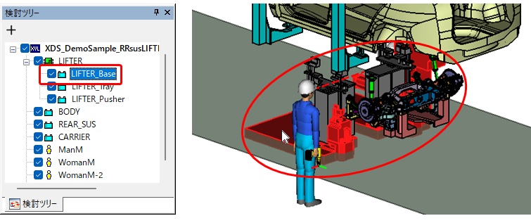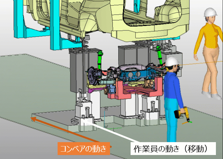 コンベアなどの足元が移動する作業場所に立って作業する場合も、人体モデルを Passive 定義することで、立ち位置を移動することができます。