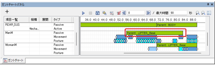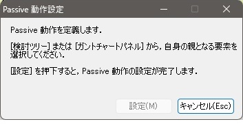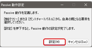 - Passive 動作設定ダイアログの設定ボタンをクリックするPassive バーに親が設定されます。指定時間の間、親の動作に追従して動きます。