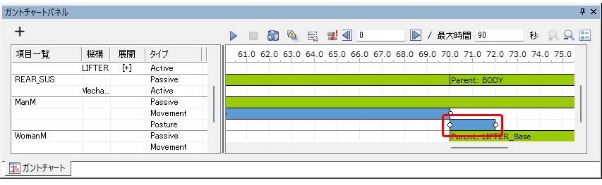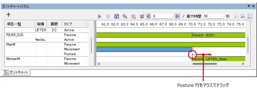 - 人体モデルの Posture 行をドラッグするドラッグした開始時刻からドロップした終了時刻まで、Posture バー(デフォルト:青色)が作成されます。