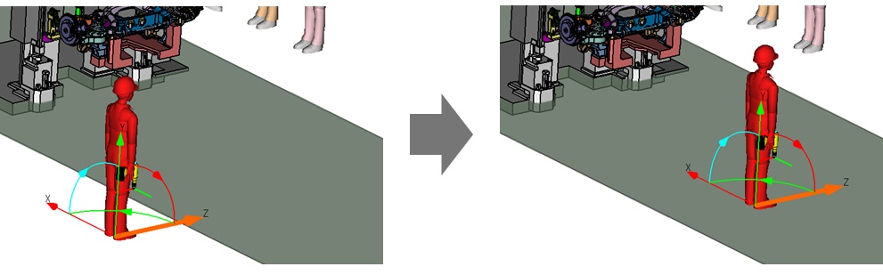 人体移動/回転ダイアログが表示され、人体モデルにマニピュレータが表示されます。 - マニピュレータの軸を移動させ、期待する位置まで人体モデルを移動させる