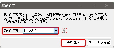 - 終了姿勢のプルダウンメニューにポジション名称を入力し、実行ボタンをクリックする現在の位置がポジションに登録され、終了位置に設定されます。アニメーションを再生すると、終了位置までの移動動作を確認できます。