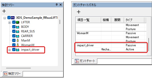 検討ツリーからガントチャートに追加したい人体モデルを選択し、検討要素の追加ダイアログでガントチャートの追加先を選択する