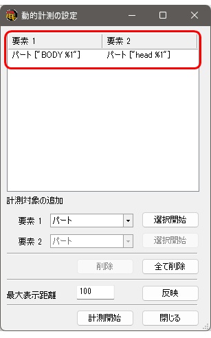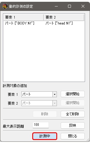 設定をすると、指定したパートが要素 1、要素 2 に表示されます。 - 計測開始ボタンをクリックして、動的計測をスタートする計測開始ボタンが計測中に変わります。