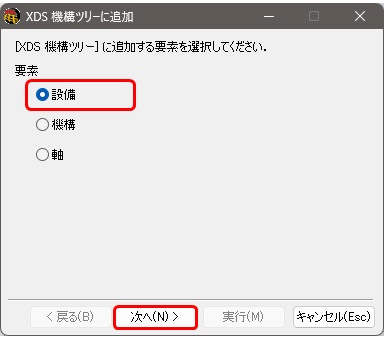 まず先頭の「設備」をXDS 機構ツリー直下に登録します。