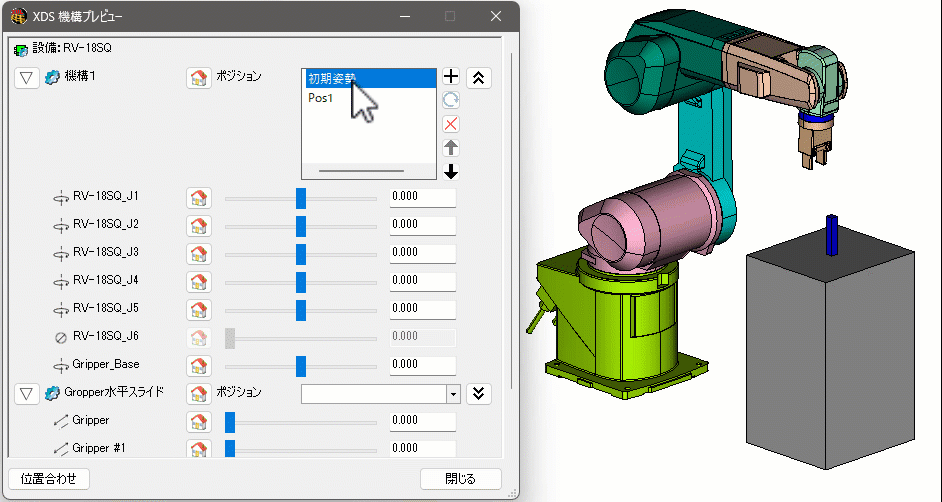 機構プレビューでは各軸の位置を組み合わせポジションとして保存することができ、ガントチャートでそのポジションを利用することができます。