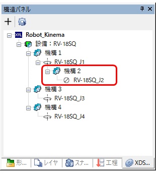 XDS 機構ツリーでは機構、軸の移動(親子の変更)ができます。
