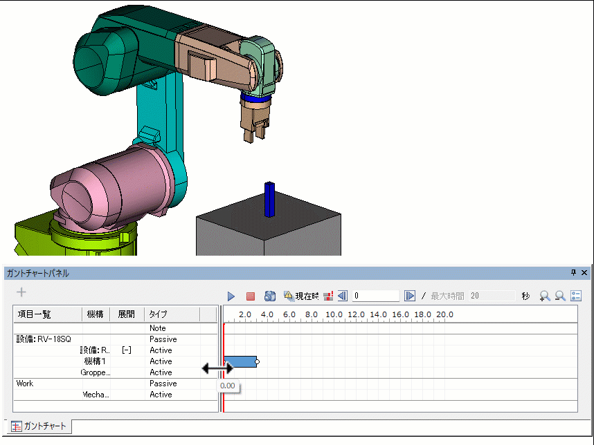 - マニピュレータの移動が完了したら、設定ボタンをクリックする現在の位置がポジションに登録され、終了位置に設定されます。アニメーションを再生すると、開始位置から終了位置までの移動動作を確認できます。