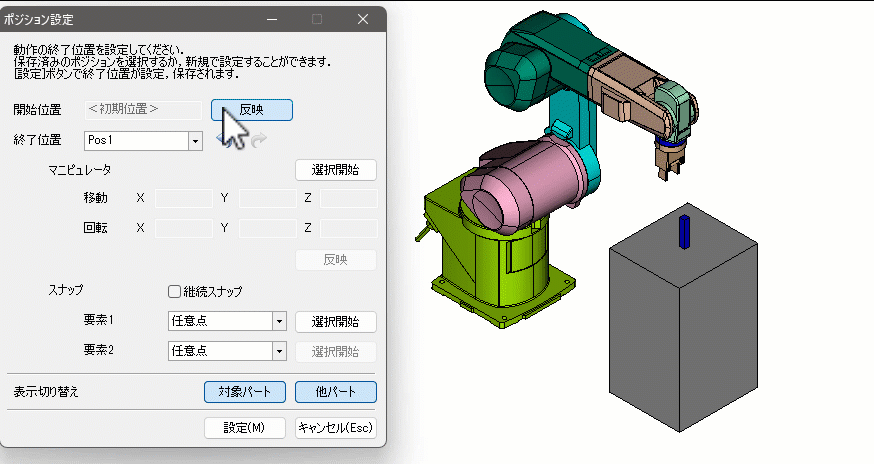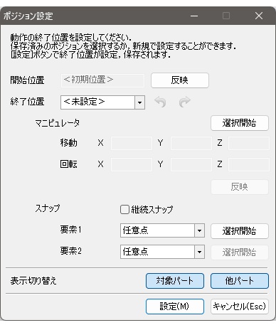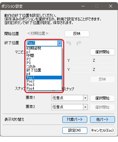 - ポジション設定ダイアログ内の終了位置のプルダウンメニューから、機構プレビューで登録したポジションを指定する