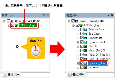 | 1 要素 | 選択モードに切り替えてビュー上の要素をクリックすると、ツリーやパネル上の該当要素の名称が反転表示されます。![]() ヒント: